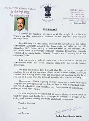 MESSAGE from Governor of Tripura on the occasion of the Republic Day on 26th January 2026